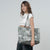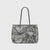 Tote en drill con estampado continuo de pitón y forro interno. Tiene el logo en aplique delantero, bolsillo interno y cierre. Las cargaderas y la base son en material sintético.