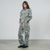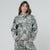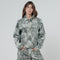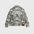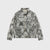Chaqueta de mujer gris hecha en drill en estampado continuo. Tiene estampados adelante y atrás, detalle de garra en la parte de atrás del fajón, cierre metálico y bolsillos adelante. Los puños son ajustables con botón.