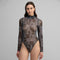 Body hecho en mesh con un diseño sublimado en toda la prenda. Tiene el cuello semi-alto y dos botones en la entrepierna para cerrar.