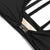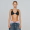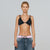 Top negro hecho en licra y malla. El logo es un herraje metálico en el pecho. Tiene cargaderas dobles.